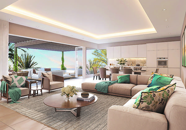 Les appartements disposent de pièces ouvertes sur l’extérieur, inondés de lumières. Le salon ouvre sur une terrasse extérieure privative bénéficiant d’une vue imprenable sur les jardins environnants. La pièce à vivre comprend aussi une cuisine américaine de grande qualité.