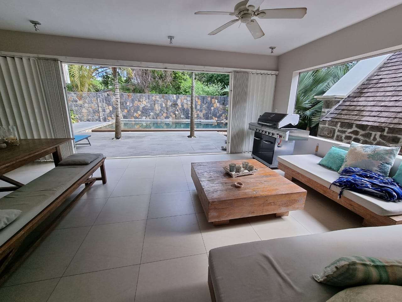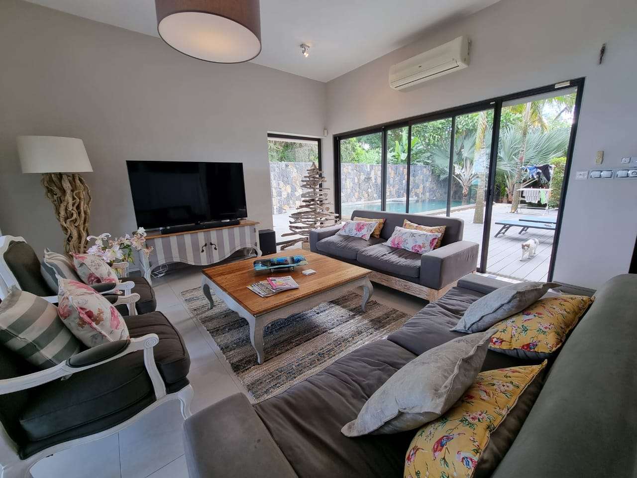 En rez de jardin : un vaste séjour climatisé s’ouvrant sur plusieurs terrasses, une double cuisine équipée climatisée, une magnifique varangue donnant sur la piscine à débordement ainsi qu’un studio indépendant au charme exceptionnel (chambre et salle de bain).